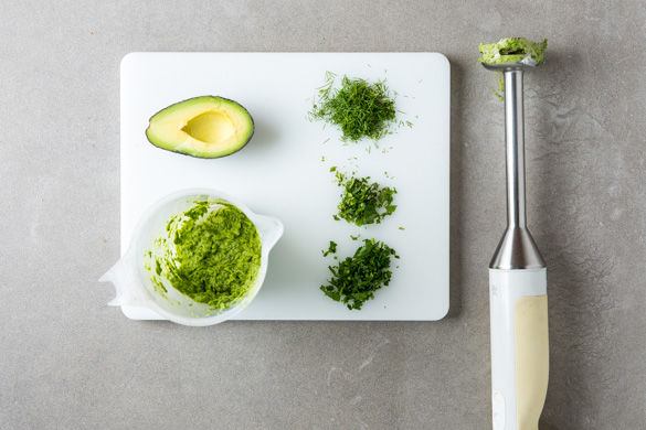 Inzwischen die Minzblätter abstreifen, Dill und Petersilie samt Stängel fein hacken. Die Avocado halbieren, entkernen und schälen. Eine Hälfte mit 2/3 der Kräuter, 1-2EL Wasser, 1EL Olivenöl, 1 Prise Salz und Pfeffer mit einem Stabmixer pürieren.