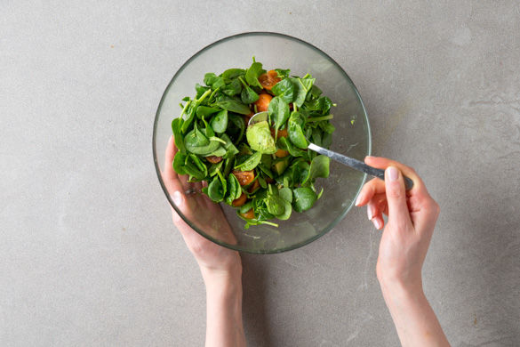 Die Tomaten halbieren. Den Spinat grob hacken. Die zweite Avocadohälfte in Würfel schneiden. Alles mit der Hälfte des Sumach mischen und mit Salz und Pfeffer leicht abschmecken.