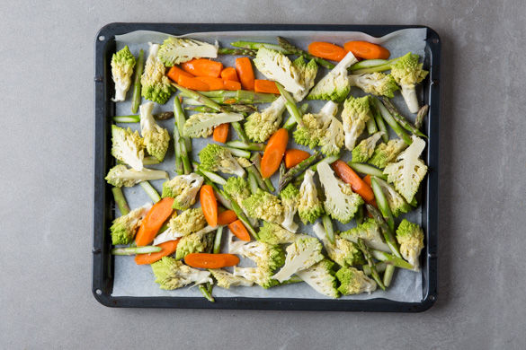 Den Ofen auf 250°C Grill vorheizen. Die hölzernen Enden des Spargels entfernen (ca. 2-3cm) und den Rest gut waschen, dann in ca. 1cm lange, schräge Stücke schneiden. Die Karotten schälen und diagonal in ca. 1cm dicke Scheiben schneiden. Den Brokkoli in kleine Röschen schneiden, den Stamm schälen und in ca. 1-2cm große Stücke schneiden.