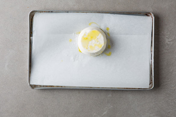 Inzwischen den Ricotta öffnen und überschüssige Flüssigkeit abtropfen lassen, dann über Kopf auf ein zweites, ebenfalls mit Backpapier ausgelegtes Backblech stürzen und großzügig mit Olivenöl und Salz bestreuen. In den letzten ca. 5Min. mit in den Ofen geben, ggfs. die Bleche tauchen (auf mittlerer Schiene) und leicht goldbraun backen.