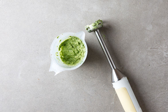 Die Haselnüsse mit dem Bärlauch und Käse sowie 1-2EL Olivenöl und 2-3EL Wasser mithilfe eines Stabmixers zu einem cremigen Pesto ein pürieren. Mit Salz und Pfeffer abschmecken. Evtl. etwas mehr Wasser oder Öl zufügen.