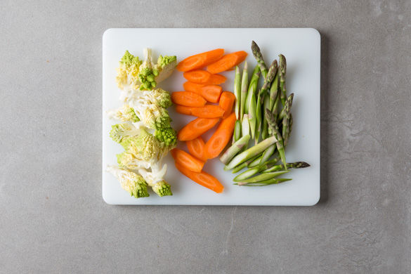 Den Ofen auf 250°C Grill vorheizen. Die hölzernen Enden des Spargels entfernen (ca. 2-3cm) und den Rest gut waschen, dann in ca. 1cm lange, schräge Stücke schneiden. Die Karotten schälen und diagonal in ca. 1cm dicke Scheiben schneiden. Den Brokkoli in kleine Röschen schneiden, den Stamm schälen und in ca. 1-2cm große Stücke schneiden.