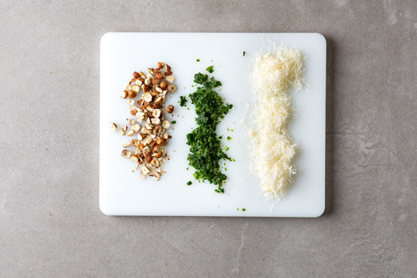 Inzwischen den Bärlauch grob schneiden. Den Käse grob reiben. Die Haselnüsse grob hacken.