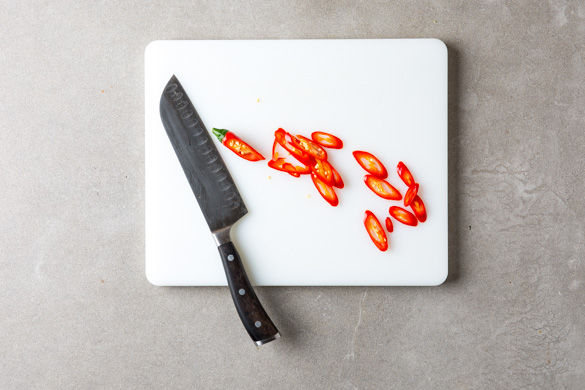 Zum Schluss die Peperoni je nach Schärfewunsch entkernen und in feine Ringe schneiden und auf den Ricotta mit dem gegrillten Gemüse und Pesto servieren.