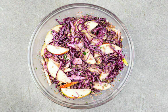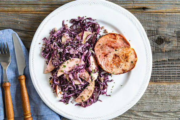 Leckere Quinoa verfeinert den Salat mit knackigem Rotkohl, Fenchel, Apfelscheiben und Walnüssen. Dazu gibt es ein saftig-zartes Schweinesteak. Genuss pur und ein schnelles Low-Carb-Rezept für einen unbeschwerten Feierabend!