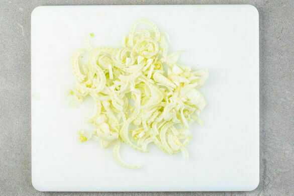 In einem mittelgroßen Topf 800ml leicht gesalzenes Wasser für die Quinoa zum Kochen bringen. Den Fenchel längs halbieren und in dünne Streifen schneiden, dabei die Stiele entfernen.