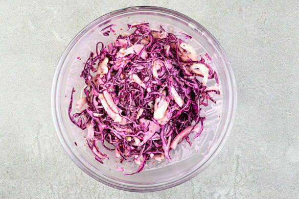 Den Rotkohl in feine Streifen schneiden. 2EL Honig, 2EL Senf, 4EL Mayonnaise, 4EL Olivenöl und 2EL Essig gut verrühren. Das Dressing mit dem Fenchel und dem Rotkohl zu einem Salat vermengen.