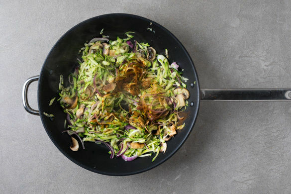 Die Pilze in einer großen Pfanne mit 1EL Olivenöl 3–4Min. goldbraun anbraten. Die Zucchini und die Zwiebeln hinzugeben und 2–3Min. mitbraten, bis die Zwiebeln leicht gebräunt sind. Mit der 1/2 der Gewürzmischung sowie Salz und Pfeffer abschmecken. Tipp: Je nach Schärfewunsch kann mehr oder weniger Gewürzmischung verwendet werden.