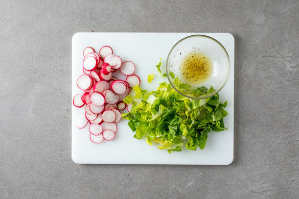 Den Romanasalat in ca. 2cm breite Streifen schneiden, dabei den Strunk entfernen. Die Radieschen putzen und in dünne Scheiben schneiden. Die Limettenschale abreiben, dann die Limetten halbieren und auspressen. Für das Dressing 1–2EL Olivenöl mit 1–2EL Limettensaft verrühren und mit Salz und Pfeffer würzen.