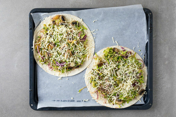 Für dieses schnelle Gericht bereitest du die Quesadillas auf die amerikanische Art zu: Dazu werden die Tortillas wie ein Sandwich mit einem gebratenen Mix aus geraspelter Zucchini, Champignons und roten Zwiebeln sowie geriebenem Käse gefüllt und im Ofen gebacken. Ein erfrischender Crème-fraîche-Dip mit Limette und ein knackiger Radieschensalat sind die perfekte Ergänzung.