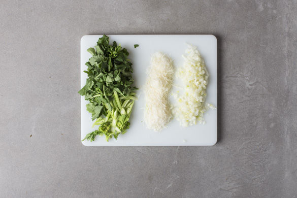 Den Brokkoli in kleine Röschen schneiden. Die Zwiebel schälen, halbieren und in feine Würfel schneiden. Den Käse fein reiben.