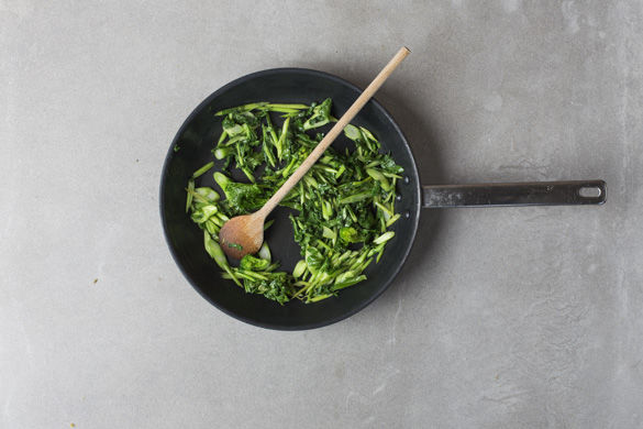 In einer großen Pfanne 1-2EL Olivenöl erhitzen und die Zwiebeln ca. 1-2Min. farblos anschwitzen, dann den Reis dazu geben und ca. 1-2Min. mitrösten. Dann nach und nach mit der Brühe ablöschen und regelmäßig rühren, bis der Reis sämig und bissfest wird - das dauert ca. 18-20Min. Evtl. etwas mehr Wasser zufügen.