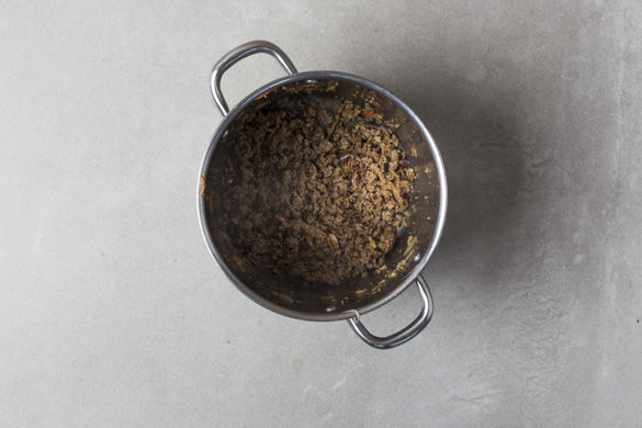 In einem mittleren Topf 1-2EL Olivenöl auf mittlerer Hitze erwärmen und die Zwiebel und den Knoblauch ca. 1-2Min. braten und je nach Geschmack die Hälfte oder das ganze Gewürz unterrühren. Vorsicht, das Gewürz ist sehr scharf. Dann das Fleisch dazugeben un weitere ca. 4-5Min. mitbraten.
