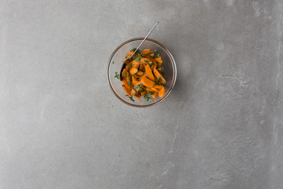 Die Karotten schälen, längs halbieren und in dünne, schräge Scheiben schneiden, leicht mit Salz und Zucker mischen und vorerst zur Seite stellen.