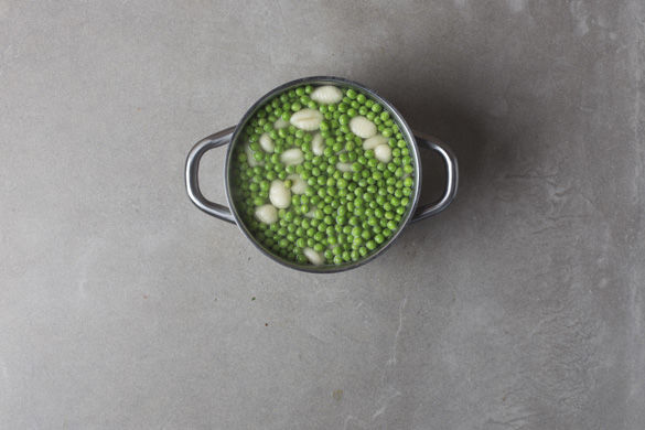 Sobald das Wasser kocht, die Gnocchi und Erbsen ca. 4-5Min. kochen lassen, bis die Gnocchi anfangen, an die Wasseroberfläche zu schwimmen. Beides durch ein Sieb abgießen und abtropfen lassen, ca. 100ml Pastawasser auffangen.