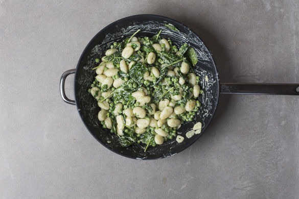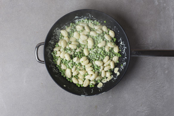 Eine große Pfanne mit 1-2EL Olivenöl mittelhoch erwärmen und den Knoblauch ca. 1Min. farblos darin anschwitzen. Dann die Gnocchi und Erbsen hinzufügen und ca. 2-3Min. anbraten.