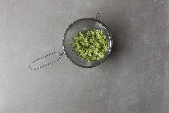 Den Grillofen auf 250-275°C vorheizen. Die Enden der Zucchini entfernen und mit der groben Seite der Küchenreibe raspeln - überschüssige Flüssigkeit durch ein Sieb auswringen.