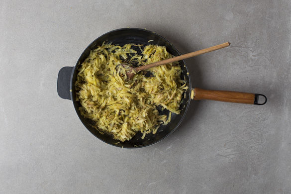 In einer tiefen, ofenfesten Pfanne 1-2EL Olivenöl auf hoher Hitze erwärmen und die Zucchini mit einer Prise Salz ca. 6-8Min. anbraten bis die Flüssigkeit verdampft ist. Inzwischen, falls gewünscht, die Kartoffeln schälen, grob raspeln und ebenfalls auswringen.