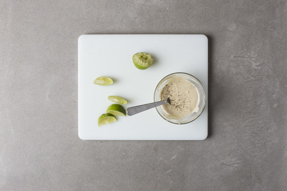In der Zwischenzeit den Knoblauch schälen und mit einer Knoblauchpresse pressen oder sehr fein hacken. Die Limette halbieren und eine Hälfte entsaften. 1-2TL Limettensaft mit Tahini, 2-3EL Wasser und Knoblauch mischen, mit Salz und Pfeffer abschmecken. Tipp: Wer mag, kann weitere 1-2EL Olivenöl hinzufügen. Die restliche Limette in Spalten schneiden.