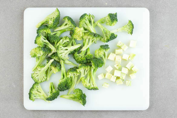In einem mittelgroßen Topf mit Dämpfeinsatz oder passendem Sieb 300ml leicht gesalzenes Wasser zum Kochen bringen. Den Reis in einem Sieb kalt abspülen, bis das Wasser klar bleibt. Den Brokkoli in mundgerechte Röschen schneiden, den Strunk ggf. schälen und in 1–2cm große Würfel schneiden.