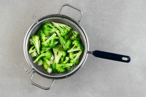 Den Reis in das kochende Wasser und den Brokkoli in den Dämpfeinsatz oder das Sieb geben und beides abgedeckt bei niedrigster Hitze 12–14Min. kochen, bis das Wasser aufgesogen und der Brokkoli gar ist. Den Reis noch ca. 5Min. ohne Hitzezufuhr ziehen lassen.