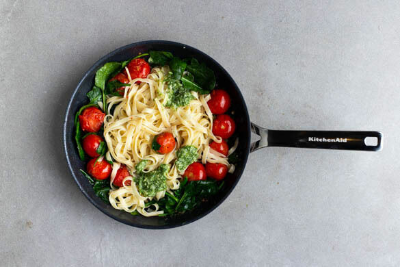 Heute überraschst du deine Lieben mit einem spannenden Geschmackserlebnis: Zwischen Tagliatelle und Kirschtomaten versteckt sich Queller, eine fleischige und salzhaltige Pflanze der Meeresküste. Mit zitronigem Mandel-Dill-Pesto und edlem Lachsfilet, das wir goldrichtig in unserer KitchenAid-Pfanne braten, wird dieses Gericht für viel Gesprächsstoff zu Tische sorgen!