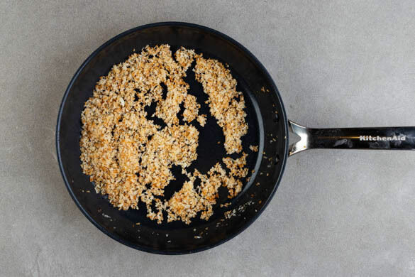 Den Knoblauch schälen und fein würfeln. Die Pfanne auswischen und den Knoblauch in der Pfanne mit 4EL Margarine oder Olivenöl bei mittlerer Hitze ca. 30Sek. anschwitzen. Das Panko-Paniermehl und 1 Prise Salz dazugeben und ca. 3Min. rösten, bis das Paniermehl goldbraun ist. Gelegentlich umrühren.