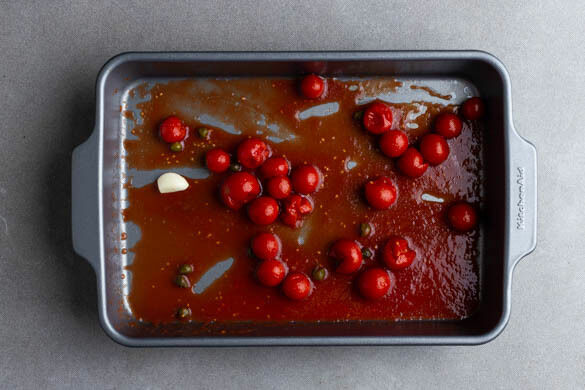 Die Kapern in einem Sieb abtropfen lassen und mit der ½ der Kirschtomaten in einer Auflaufform mit je 1EL Olivenöl und Balsamicoessig und je 1 Prise Salz und Pfeffer vermengen. Den ungeschälten Knoblauch dazugeben und alles im Ofen 9–11Min. rösten, dabei die Tomaten nach der Hälfte der Zeit mit einer Gabel leicht zerdrücken.