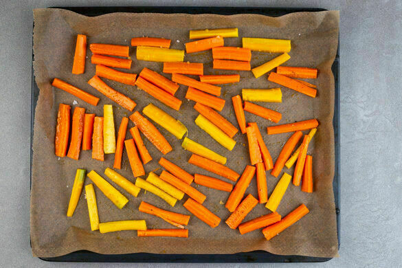 Den Backofen auf 240°C (220°C Umluft) vorheizen. Die Karotten ggf. schälen und in fingerdicke, pommesartige Stifte scheiden. Auf einem mit Backpapier ausgelegten Backblech mit 2EL Olivenöl und 1 kräftigen Prise Salz vermengen und 20–25Min. im Ofen rösten, bis die Karotten goldbraun und gar sind.