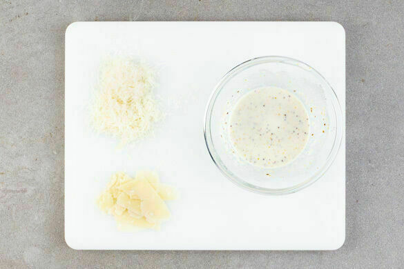 Ca. 3/4 des Käses fein reiben, den restlichen Käse in dünne Scheiben schneiden. Den Knoblauch schälen und halbieren, zwei Hälften fein würfeln und mit 2EL Mayonnaise, dem Senf, der 1/2 des geriebenen Käses und 5–6EL Wasser verrühren. Das Dressing mit Salz und Pfeffer abschmecken. Den übrigen Knoblauch aufbewahren.