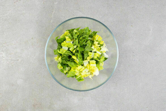 Den Salat in dünne Streifen schneiden, dabei den Strunk entfernen.