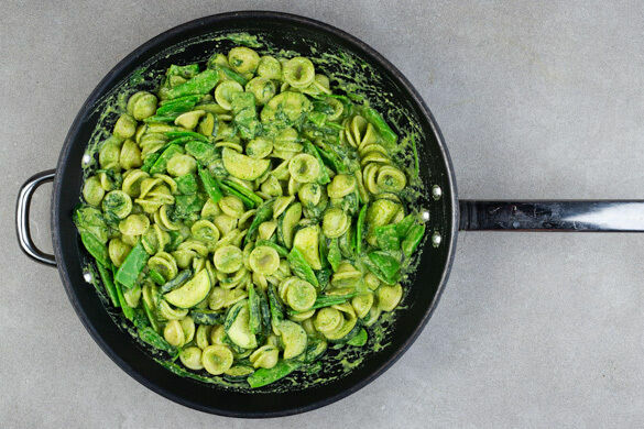 Heute gibt’s was auf die Ohren. Beziehungsweise auf die Geschmacksknospen. Naja, ist ja auch egal – bei all den Aaahs und Ooohs, die dein Abendessen lautmalerisch begleiten werden ... Und was wäre da passender als feine Orecchiette – italienisch für „kleine Öhrchen" – zu servieren? Diese laufen aber erst mit gebratener Zucchini, Kaiserschoten, Dukkah-Gewürz und einem leckeren Pesto aus Spinat und Walnüssen zur Höchstform auf!