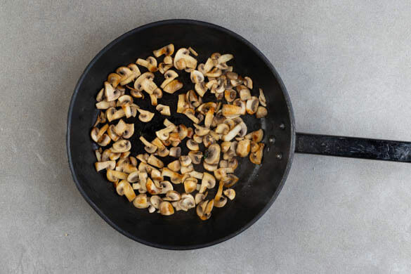 Die Pilze ggf. säubern und in ca. 1cm dicke Scheiben schneiden. In einer mittelgroßen Pfanne mit ½EL veganer Margarine und 1 Prise Salz bei starker Hitze in 6–8Min. goldbraun anbraten.