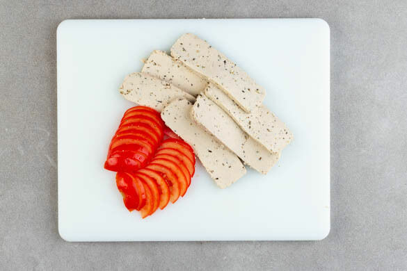 Die Tomate halbieren und in dünne Scheiben schneiden. Mit einem sauberen Küchentuch vorsichtig so viel Flüssigkeit wie möglich aus dem Tofu pressen, dann den Tofu in ca. 0,5cm dicke Scheiben schneiden und mit der Sojasauce vermengen.
