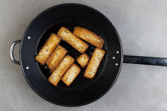 Den Tofu in der Pfanne mit 1EL Pflanzenöl bei mittlerer Hitze auf jeder Seite 3–4Min. goldbraun anbraten. Aus der Pfanne nehmen und auf etwas Küchenpapier abtropfen lassen.