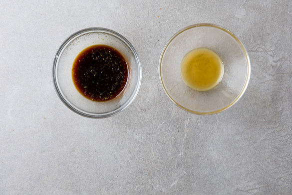 Inzwischen für die Ponzu die Schale der Limette abreiben, den Saft auspressen und mit der Sojasauce und 1-2TL Zucker verrühren. Aus je 2EL Essig, Olivenöl, Wasser, Salz, Pfeffer und Zucker ein einfaches Dressing für den Salat mischen.