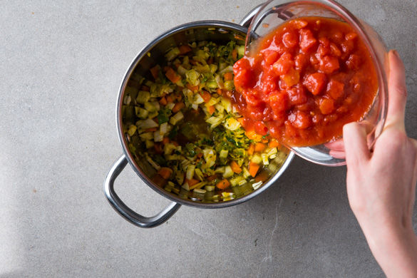 Die gehackten Tomaten mit den Karotten und Fenchel ebenfalls hinzugeben und weitere ca. 5-6Min. ziehen lassen. Inzwischen den Ofen auf 220°C Umluft vorheizen.