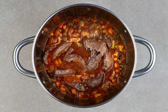 Die Brühe angießen, abgedeckt zum Kochen bringen und dann ohne Deckel bei mittlerer Hitze 5–7Min. köcheln lassen, bis die Brühe etwas eingedickt ist. Das Fleisch zurück in den Topf geben und 1–2Min. mitköcheln, bis es gar ist.