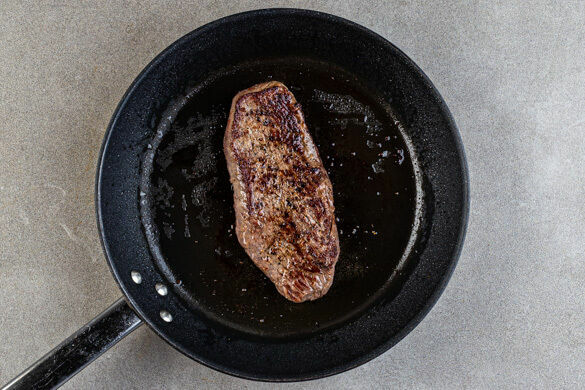 Das Fleisch trocken tupfen, mit Salz und Pfeffer würzen und in einer großen Pfanne mit 2EL Olivenöl bei starker Hitze auf der Fettseite 2–4Min. scharf anbraten. Wenden und weitere 2–4Min. braten, je nach Dicke des Fleisches. Die Hitze reduzieren und das Fleisch 1–3Min. abgedeckt garen, je nachdem, ob es medium oder durch sein soll. Abgedeckt auf einem Teller ruhen lassen.