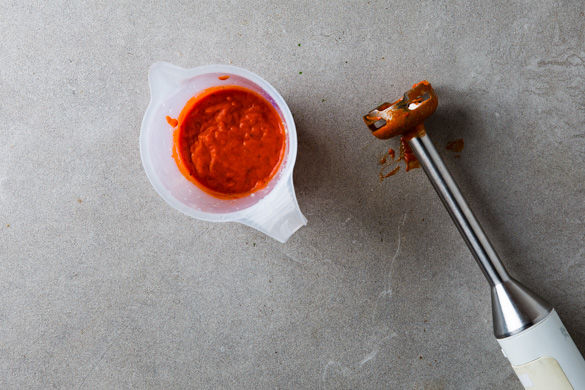 Die gegrillte Paprika mit Miso-Paste mit einem Stabmixer zu einer cremigen Sauce pürieren, mit Salz und Pfeffer abschmecken. Sobald der Reis gar ist, mit 1/2TL Salz, 1/4TL Zucker und 1-2EL Essig der Wahl (z.b. Weisswein) mischen. Erneut zudecken und ziehen lassen, dabei warm halten.
