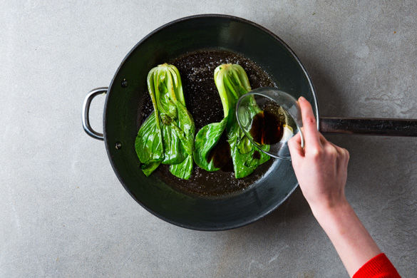 Die Pfanne erneut mit 1-2EL Sesamöl erhitzen. Den Pak Choi ebenfalls ca. 3-5Min. anschwitzen, mit 1-2EL Sojasauce abschmecken.