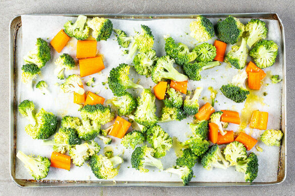 Den Backofen auf 220°C (200°C Umluft) vorheizen. Den Brokkoli in mundgerechte Röschen schneiden. Die Karotten ggf. schälen, längs halbieren und in ca. 1cm lange Stücke schneiden. Den Brokkoli und die Karotten mit 4EL Olivenöl und 1TL Salz vermengen, auf zwei mit Backpapier ausgelegten Backblechen verteilen und ca. 15Min. im Ofen backen.