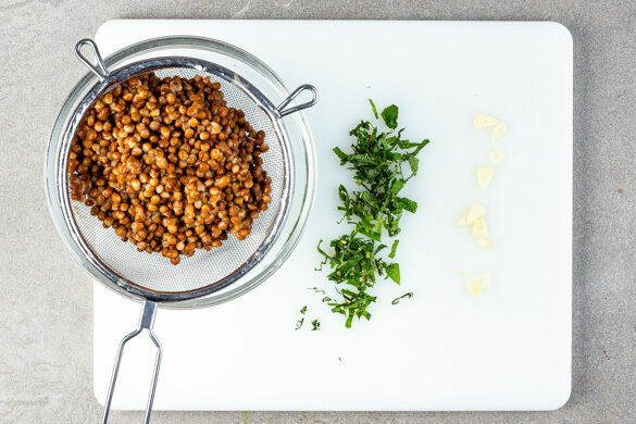 Die Linsen in einem Sieb mit kaltem Wasser abspülen und abtropfen lassen. Den Knoblauch schälen und in feine Scheibchen schneiden. Die Minzeblätter von den Stängeln zupfen und fein schneiden.