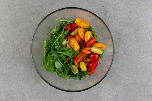 Die Zitronenschale abreiben, die Zitrone auspressen. 2EL Zitronensaft, die Zitronenschale, 3EL Olivenöl, 1TL Honig, 1TL Senf und 1 Prise Salz verrühren. Die Tomaten halbieren. Den Dill samt Stängeln fein schneiden. Den Rucola, die Tomaten, den Dill und das Dressing vermengen. Die Galettes mit dem Chutney garnieren und mit dem Salat servieren.