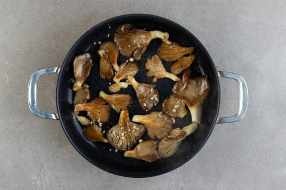 Die Pilze in einer großen Pfanne mit 1EL Olivenöl und 1 kräftigen Prise Salz bei starker Hitze ca. 5Min. anbraten, bis sie appetitlich gebräunt sind. Den Knoblauch schälen und fein würfeln, dann zu den Pilzen geben und ca. 30Sek. mitbraten. Den Ziegenfrischkäse und die Crème fraîche vermengen, glatt rühren und mit je 1 kräftigen Prise Salz und Pfeffer abschmecken.