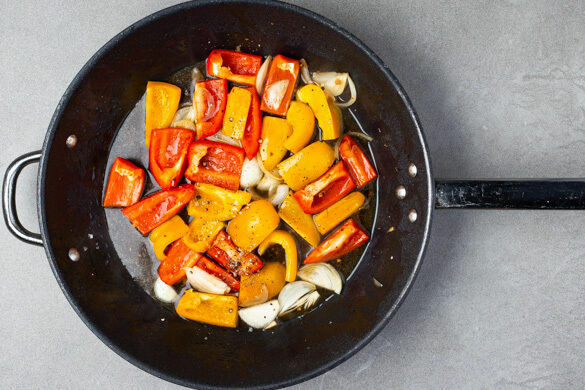 Die Paprika und die Zwiebelstreifen in derselben Pfanne bei starker Hitze 4–5Min. scharf anbraten, dabei etwas Wasser zugeben, falls das Gemüse zu schnell röstet. Mit Salz und Pfeffer würzen.