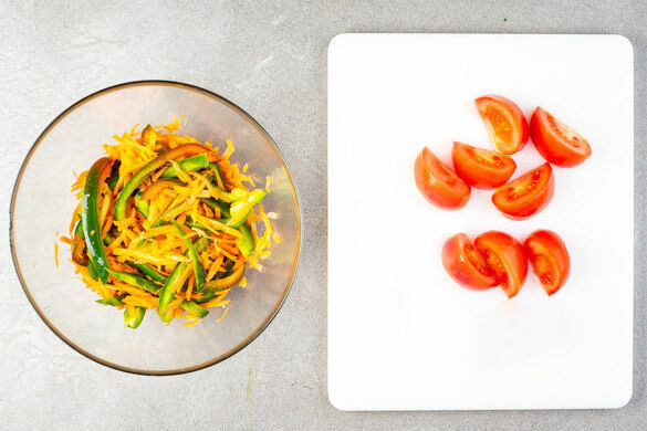 Die Karotte ggf. schälen und grob raspeln. Die Paprika vierteln, entkernen und in dünne Streifen schneiden. Die Karotten und die Paprika mit 1/2TL Salz und 1EL hellem Essig vermengen und beiseitestellen. Die Tomate in dünne Spalten schneiden.