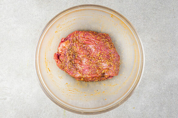 Das Fleisch in einer mittelgroßen Pfanne mit 1EL Pflanzenöl bei starker Hitze auf jeder Seite 2–4Min. scharf anbraten, je nach Dicke des Fleisches. Die Hitze reduzieren und das Fleisch noch 1–3Min. abgedeckt garen, je nachdem, ob es medium oder durch sein soll. Das Fleisch abgedeckt auf einem Teller ruhen lassen.