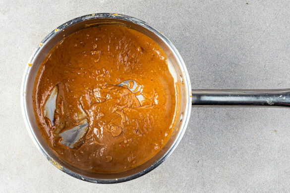 Die 1/2 der Chiliflocken und das restliche Currypulver in einem kleinen Topf mit 1EL Pflanzenöl bei mittlerer bis niedriger Hitze ca. 30Sek. anbraten. Die Erdnussbutter, die Worcestershiresauce, 80ml Wasser, 1EL hellen Essig und 1TL Honig hinzufügen und unter ständigem Rühren erwärmen, bis das Erdnussdressing eingedickt ist, dann vom Herd nehmen.