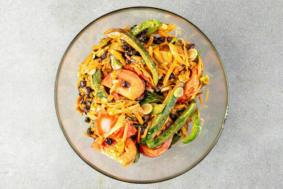 Die Karotten ggf. schälen und grob raspeln. Die Paprika vierteln, entkernen und in dünne Streifen schneiden. Die Karotten und die Paprika mit 1/2TL Salz und 1EL hellem Essig vermengen und beiseitestellen. Die Tomaten in dünne Spalten schneiden.